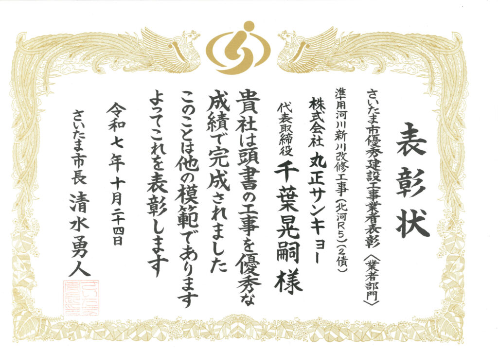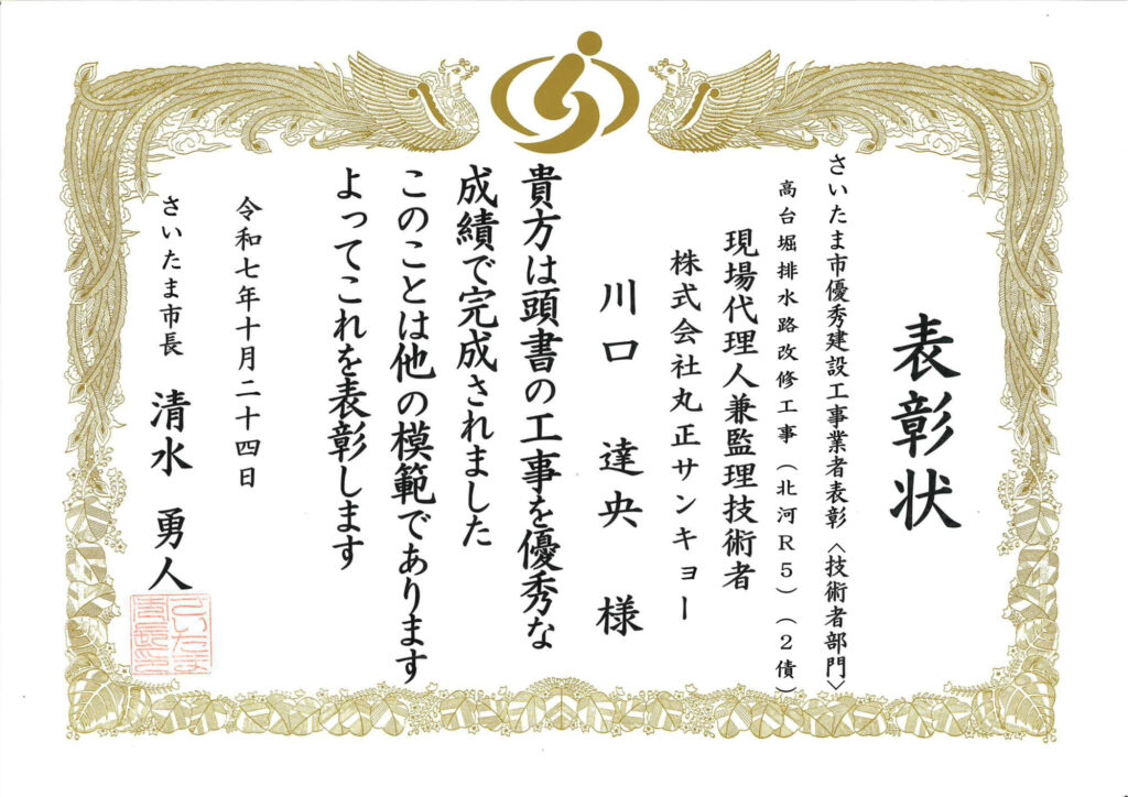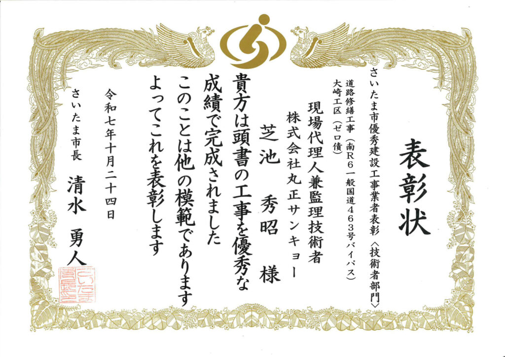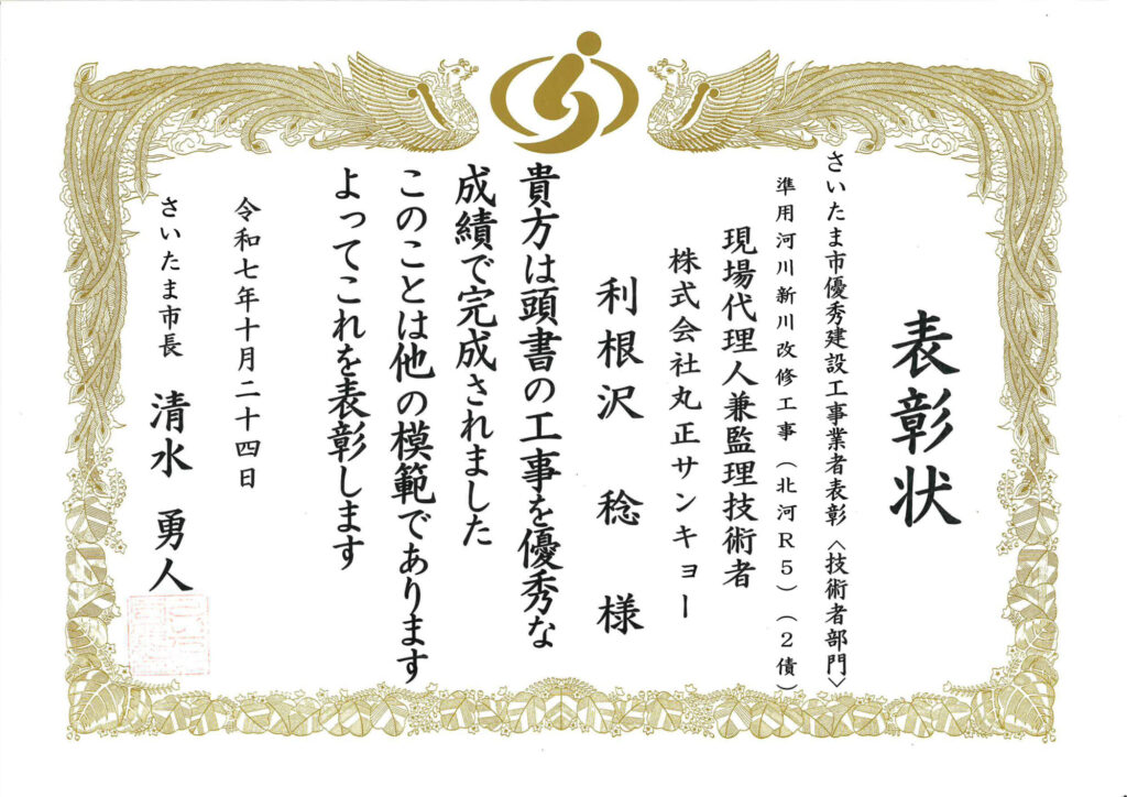 令和7年10月24日にさいたま市役所ときわ会館におきまして、さいたま市優秀建設工事業者表彰と優秀現場代理人表彰の授賞式が行われました。